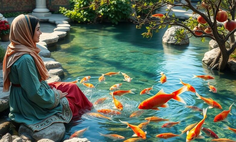- آب زلال و ماهی زنده: نشاندهنده رزق حلال و فراوان است که به راحتی به دست میآید. هرچه آب صافتر باشد، این رزق پاکتر و با برکتتر است.